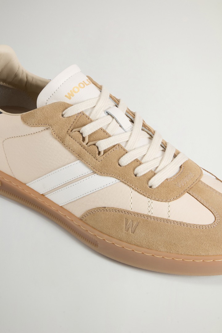 Die Doubleu Tennis Sneakers Made in Italy kombinieren raffinierte Materialien und eine grafische Identität in einem zeitgenössischen Design. Das Obermaterial besteht aus einem Mix aus Nubukleder, Kalbsleder und Veloursleder für einen raffinierten Materialeffekt. Die beiden kontrastierenden, diagonal angebrachten Seitenstreifen aus Leder ziehen sich über den Schuh und bilden das ikonische „W“ der Marke. Die heißgeprägten Logos auf Zunge, Seitenteil und Ferse fügen sich dezent ein, während die herausnehmbare Innensohle eine praktische Note hinzufügt. Die exklusiv für Woolrich entwickelte Sohle aus Naturkautschuk ist leicht, langlebig und nachhaltig und wurde entwickelt, um Komfort und sicheren Halt zu gewährleisten.
