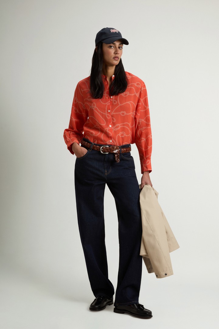 Cette chemise en lyocell mélangé, à porter sur un pantalon en lin ou en denim léger, épouse la silhouette avec un tombé souple et naturel. Elle se distingue par son imprimé de cordes tressées all-over et son col officier qui apporte une touche contemporaine. Les plis et les drapés au dos accentuent la coupe oversize, tandis que la plaquette latérale logotée orne le vêtement avec discrétion.
