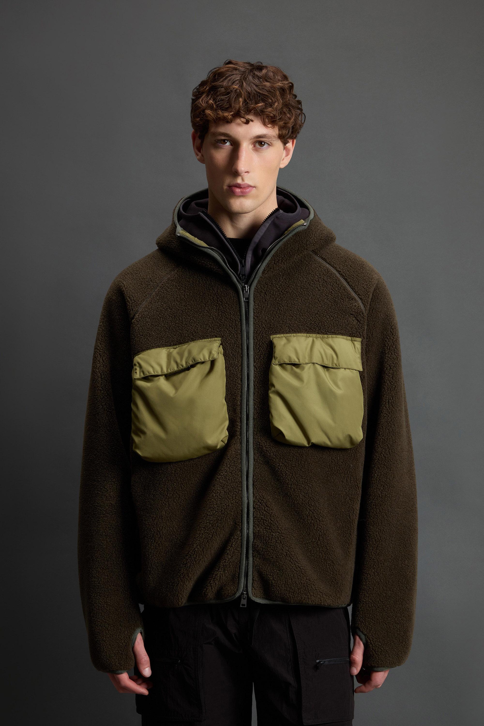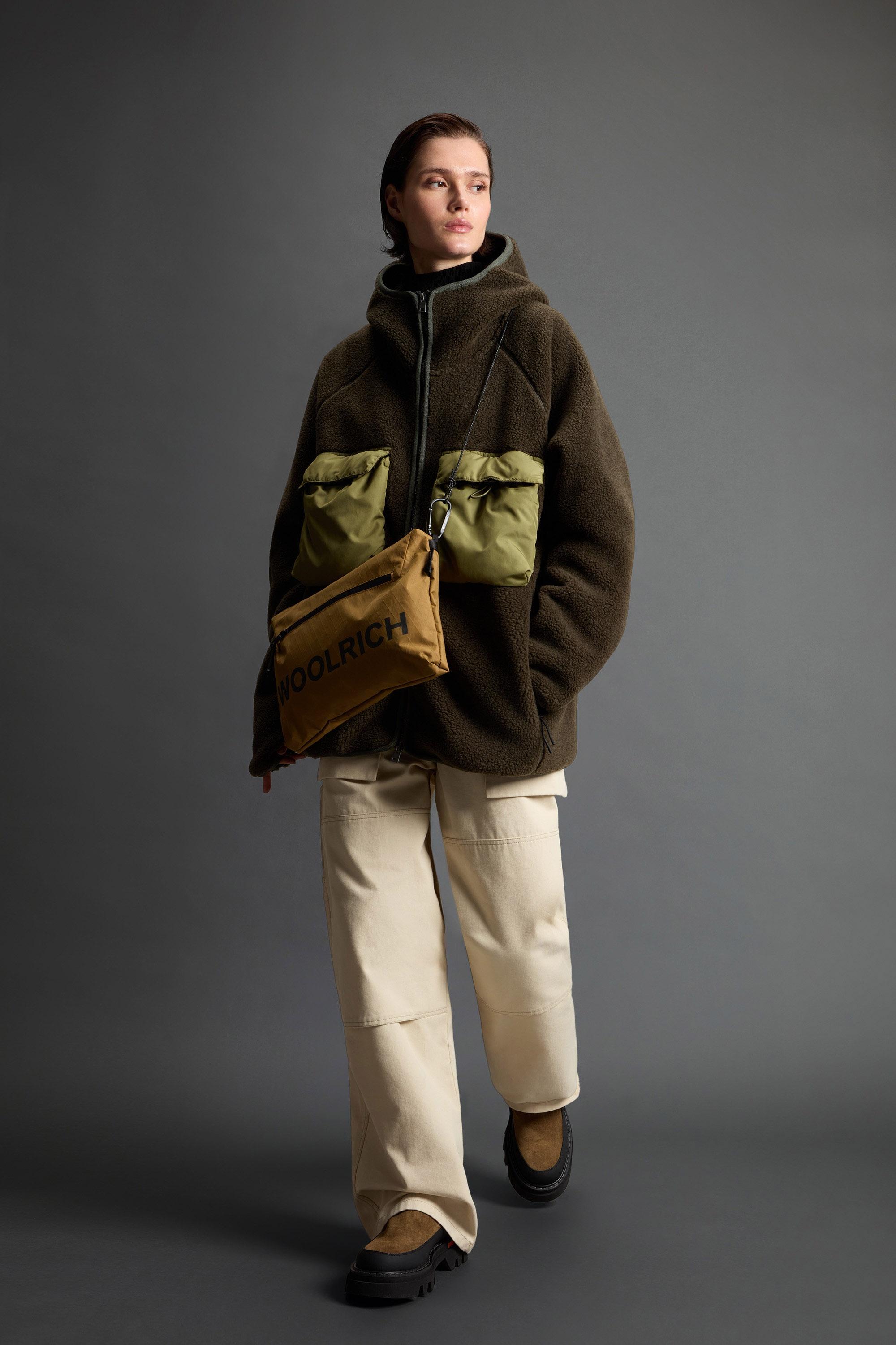 Materiali tecnici e dettagli funzionali definiscono questa felpa ibrida, parte della collezione Todd Snyder for Woolrich Black Label. Realizzata in pile sherpa italiano, si distingue per le rifiniture in tessuto a contrasto lungo zip frontale, cappuccio, fondo e polsini. Il cappuccio, ispirato alle mute da sub, ha una costruzione aderente con collo alto, pensata per garantire protezione e una linea moderna. Protagoniste del design sono le ampie tasche a soffietto sul petto, in nylon a contrasto, dotate di chiusura con fermacorda nella tasca sinistra. Completano il capo due tasche laterali con zip e polsini con aperture per il pollice, per una funzionalità curata nei minimi dettagli.