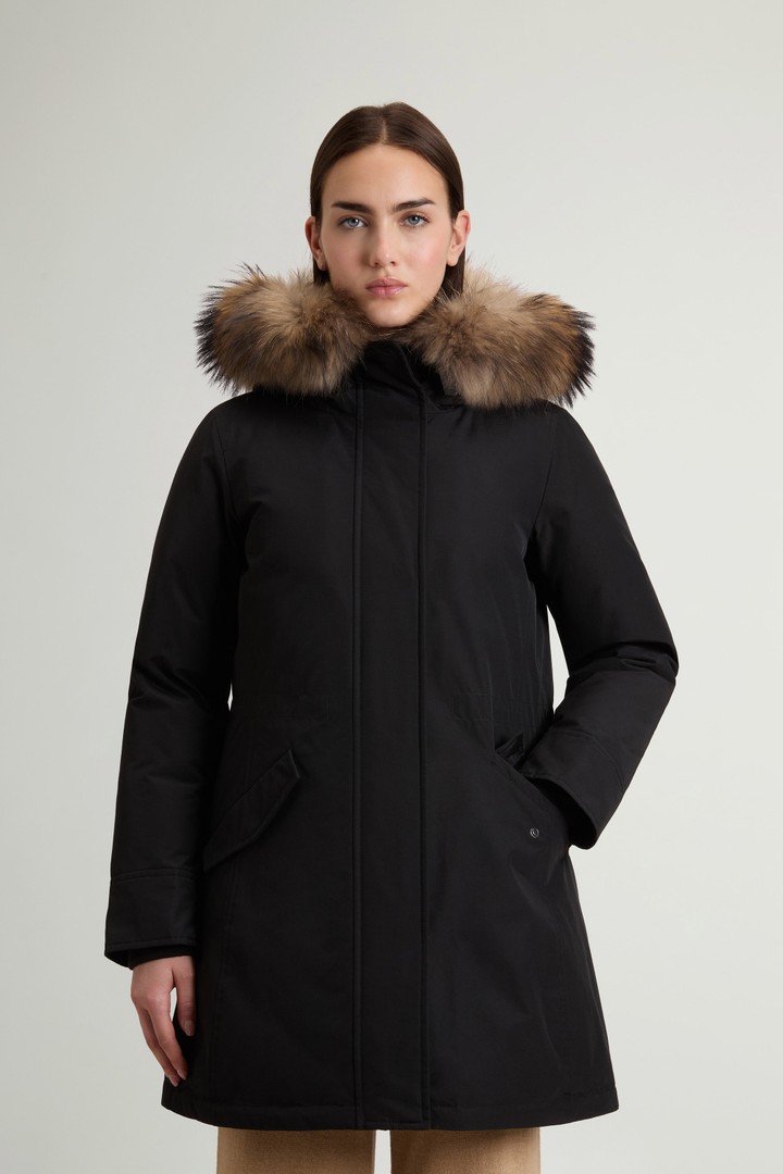 Ideal for braving winter in the city in style, this jacket combines functionality and attention to detail. It’s made from water-repellent and wind-resistant Ramar Cloth fabric and padded with duck down for warmth and comfort, even on bitterly cold days. It has zipper and snap-button fastening, and two flap pockets that provide practicality. The design features raccoon fur inserts on the hood and along the placket.