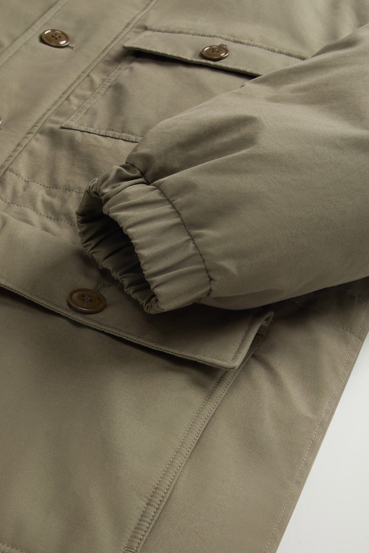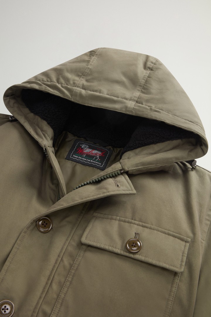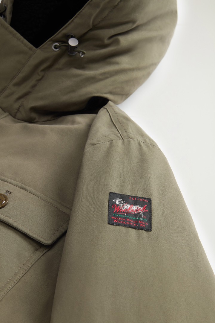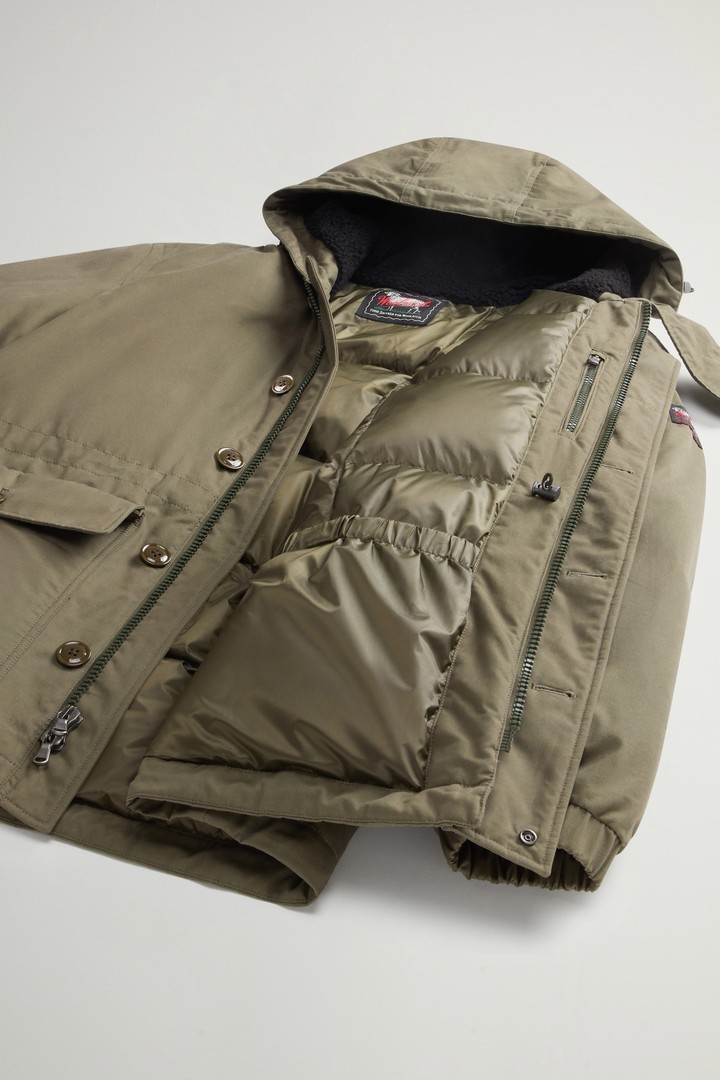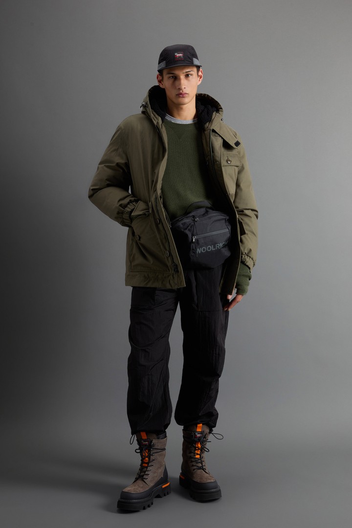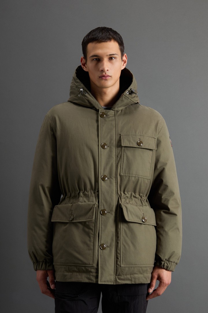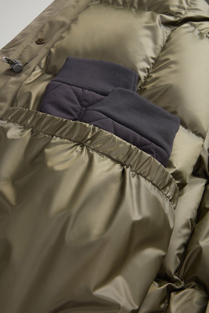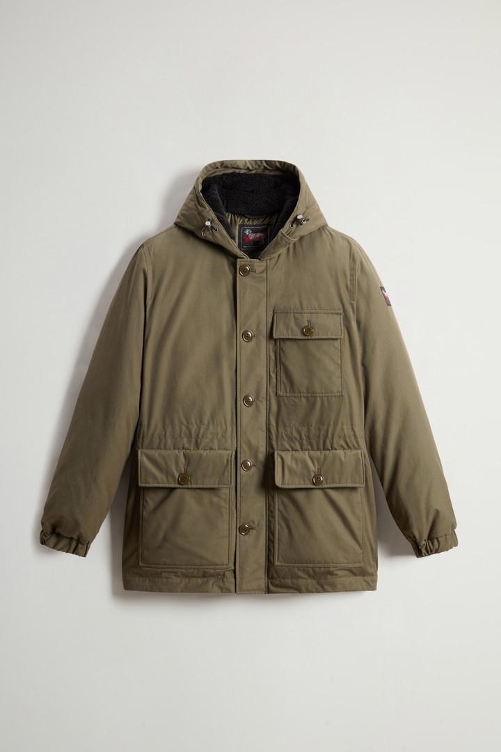 Part of the Todd Snyder for Woolrich Black Label collection, this fresh take on the parka is made from water-resistant Italian brushed cotton, a fabric processed to create a soft, velvety surface with characteristic peach-like feel. This finish is comfortable to the touch and helps to keep in warmth, all while maintaining the natural breathability of the cotton. The garment has 80/20 duck down padding and is complete with glossy, tone-on-tone ripstop inner lining. The functional design includes a drawstring-adjustable hood, wide patch pockets with flap and handwarmer side entrance, and a fit-adjusting waist drawstring. Complete with stretch cuffs, this model—sporting a minimalist, military-inspired aesthetic—is designed to offer protection and practicality.