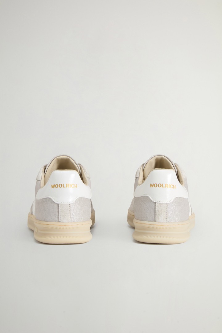 Made in Italy, the Doubleu Tennis sneakers combine refined materials and graphic style in a modern design. The upper is made from silver-colored laminated fabric, embellished with suede inserts, leather side bands and a contrasting nappa leather rear patch for a refined textural effect. The two side bands, applied diagonally, cross over the shoe to form the brand’s iconic "W" symbol. The hot-stamped logos on the tongue, side and heel offer a subtle touch, while the removable insole lends practicality. The natural rubber sole—developed exclusively for Woolrich—is lightweight, durable and sustainable, designed to provide comfort and a secure grip.