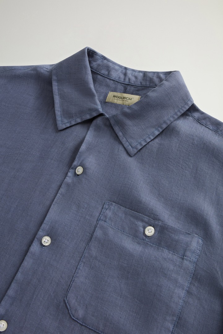 This garment-dyed shirt in pure linen is designed to provide a light feel on very warm days. The naturally breathable yarn keeps it feeling fresh and comfortable when worn. The collar provides a classic aesthetic, accompanied by a buttoned small chest pocket for a fresh casual touch. The label at the bottom of the placket gives the model a subtle signature finish. The dyeing method makes each garment distinct and may result in slight color variations.