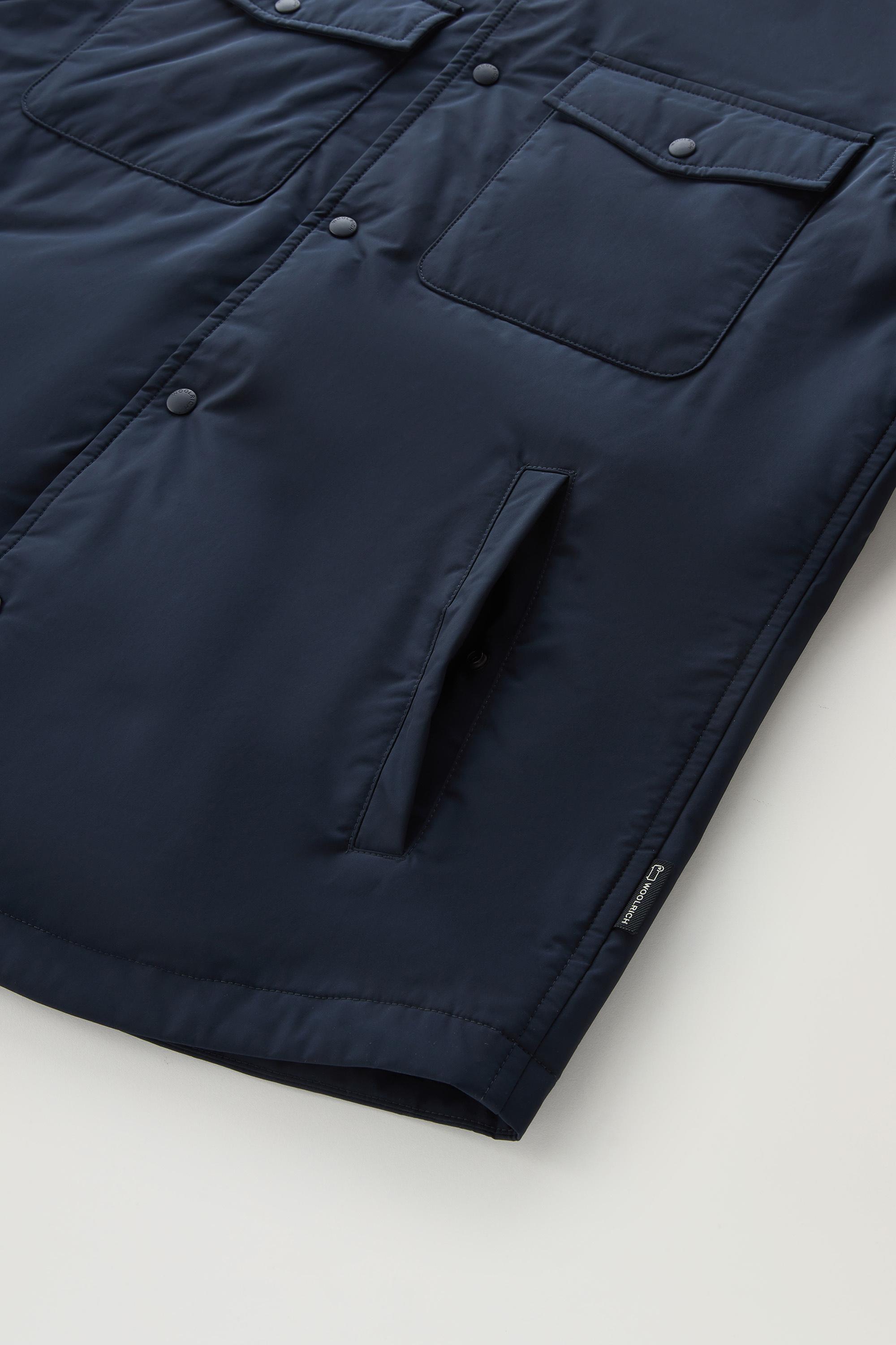 The classic workwear-inspired shirt jacket is reinterpreted with modern proportions and high-quality textures. Made from water-repellent and wind-resistant fabric, the model has a clean line with lightweight PrimaLoft® insulation, composed of 70% recycled fibers, and nylon lining. The logoed snap buttons and label on the hem of the button placket are iconic Woolrich details, while the chest pockets and welt pockets are functional, to let you organize your essentials.