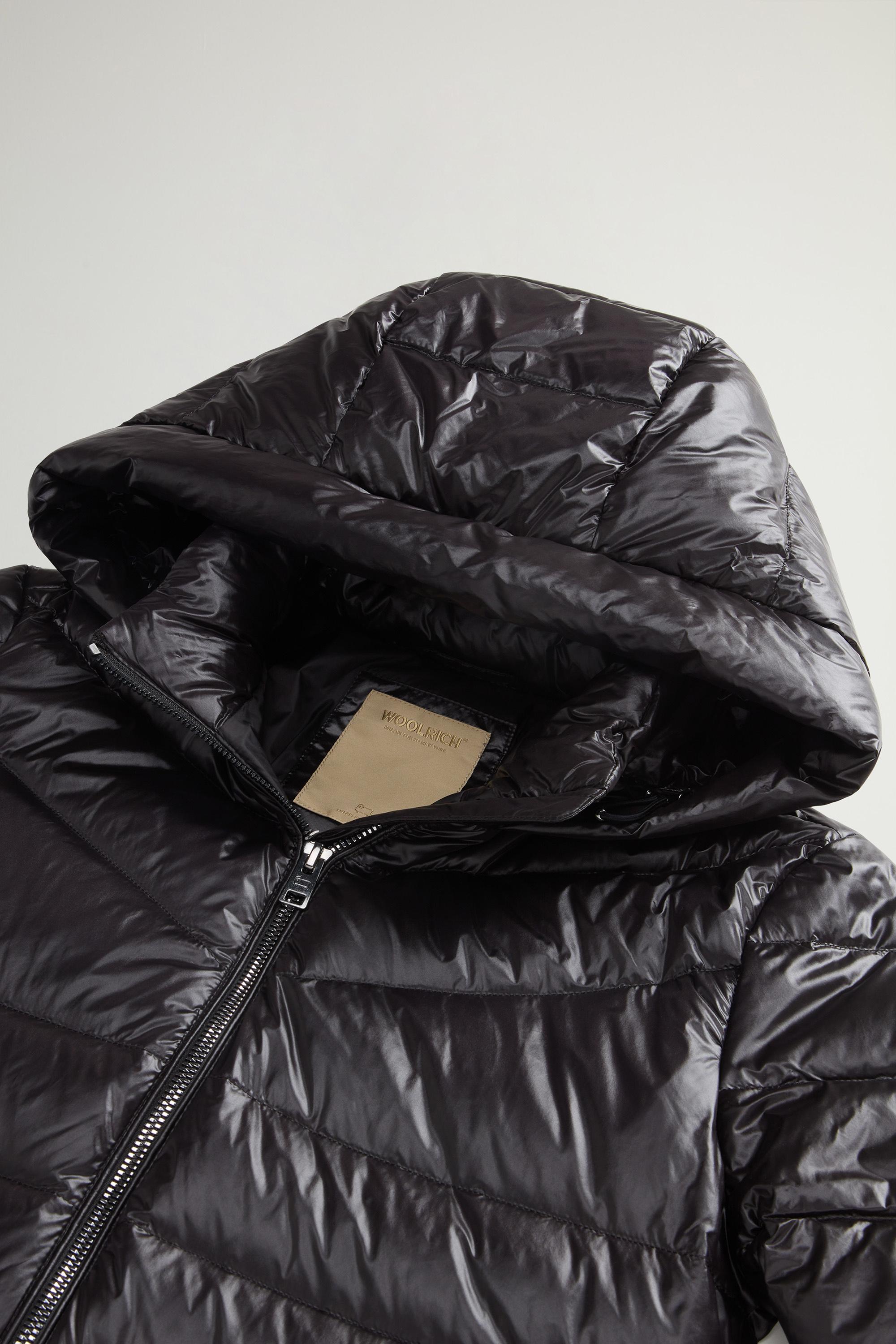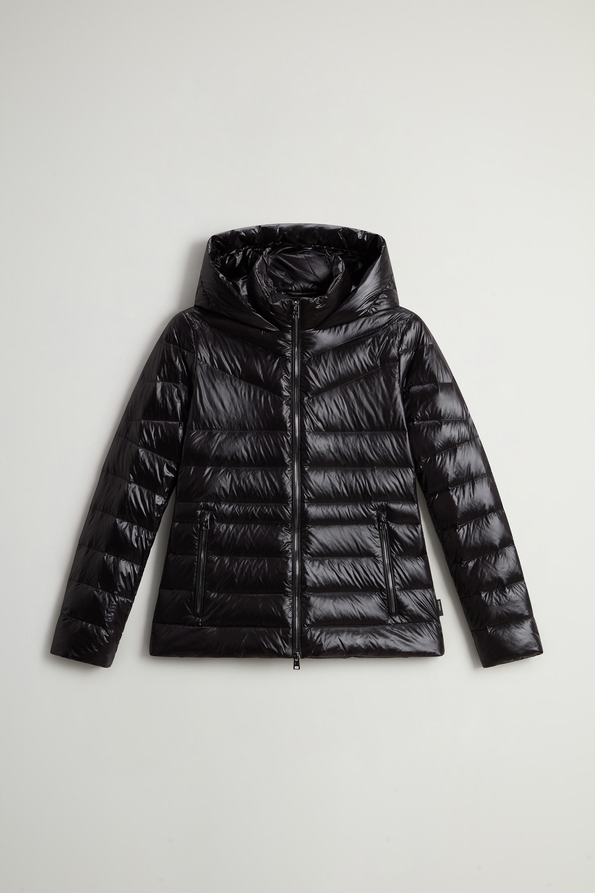 A trusty ally when the weather starts to turn, this lightweight down jacket is a must-have casual outerwear piece for your wardrobe. Made from water-repellent and wind-resistant glossy nylon, it is filled with duck down for optimal warmth. It has a large, adjustable hood with drawstring stopper, a zip fastening, and two zippered pockets. It features a combination of quilting styles – horizontal on the body and chevrons on the shoulders and sleeves – for a contemporary touch. The elastic insert on the back accentuates the garment's slim silhouette.