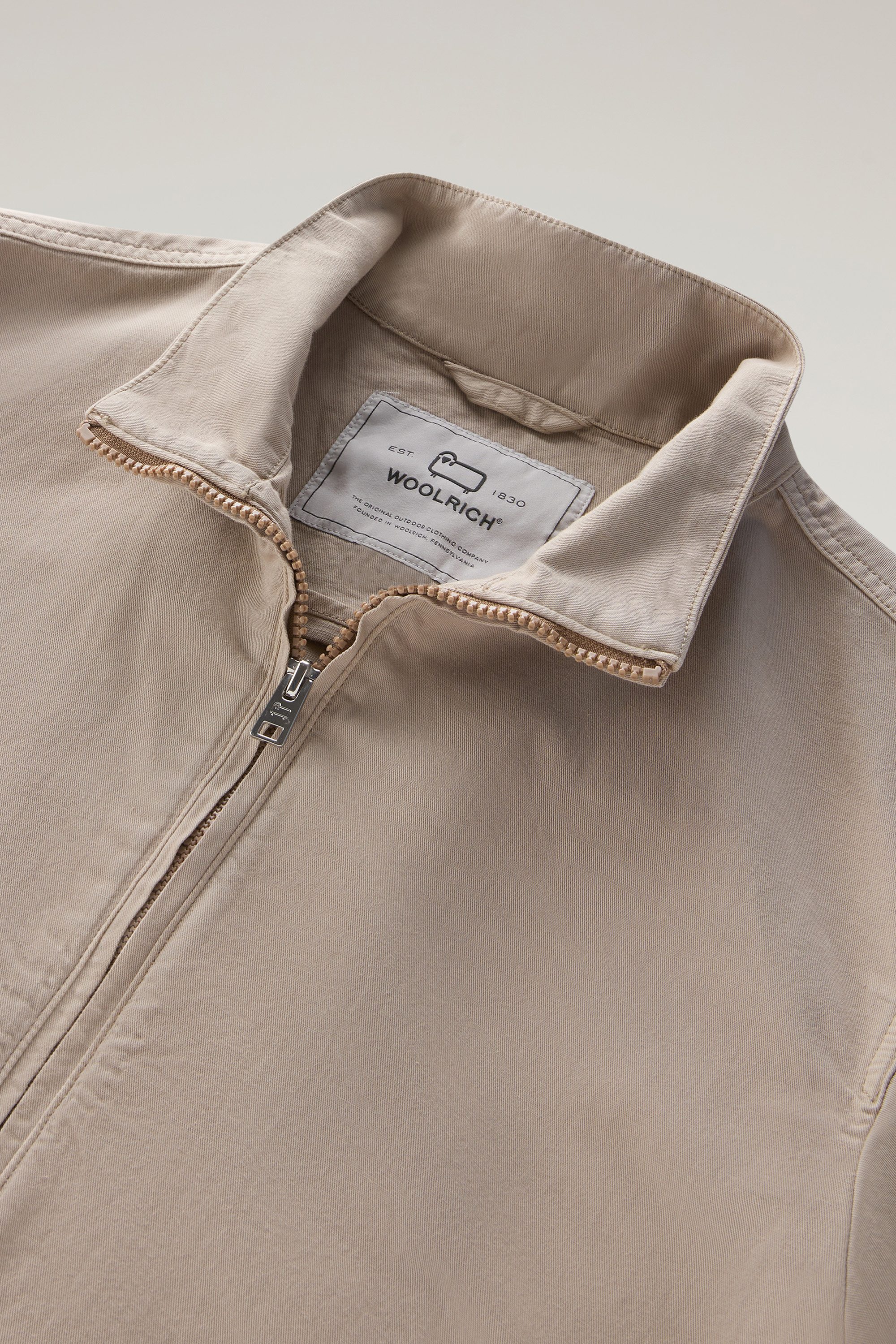 The preppy-style bomber jacket is offered in a high-quality cotton-linen blend fabric that creates a relaxed fit that feels pleasant on the skin. The garment is unlined and has a clean design with a high collar, elasticated edges, and a two-way zip fastening. The snap-buttoned pockets are convenient for storing small items, while the embroidered logo on the sleeve is the Woolrich detail that enhances the look.
