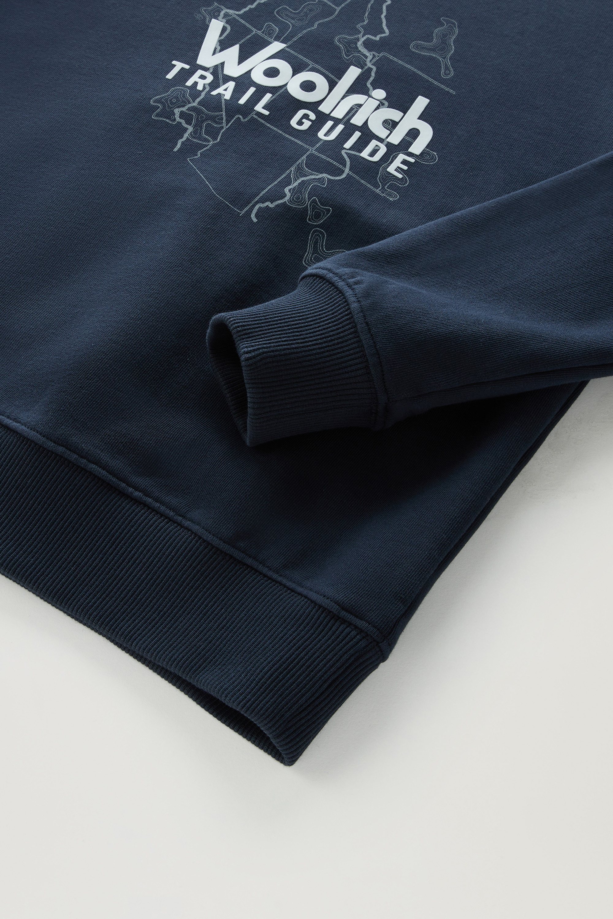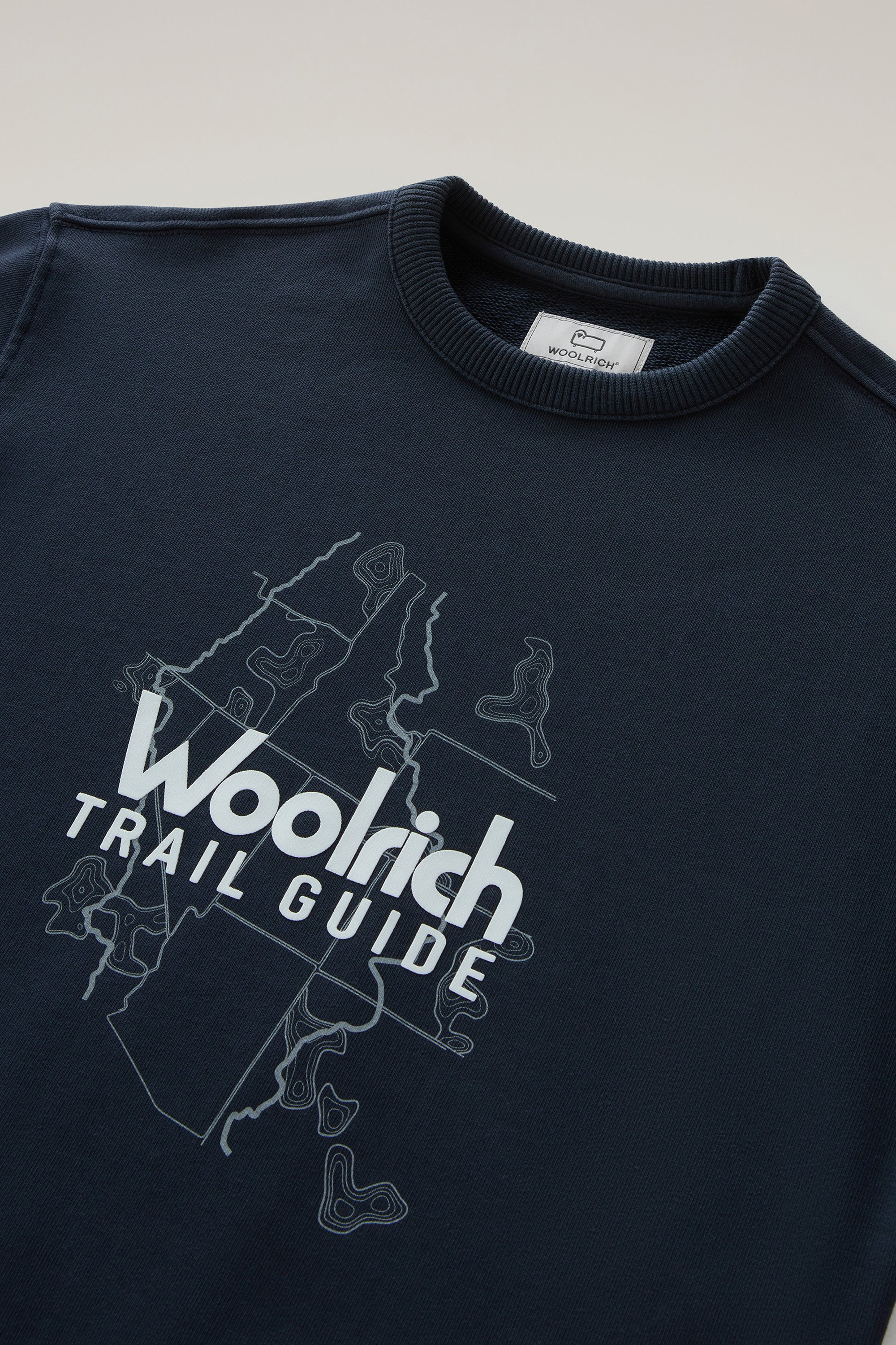 Designed for the dynamic lifestyles of boys and dedicated to their curiosity. This sweatshirt has a comfort fit for maximum freedom of movement. It features a water-based print inspired by the world of hiking and embossed Woolrich lettering. Made of a pure cotton fleece, soft and lightweight on the skin.