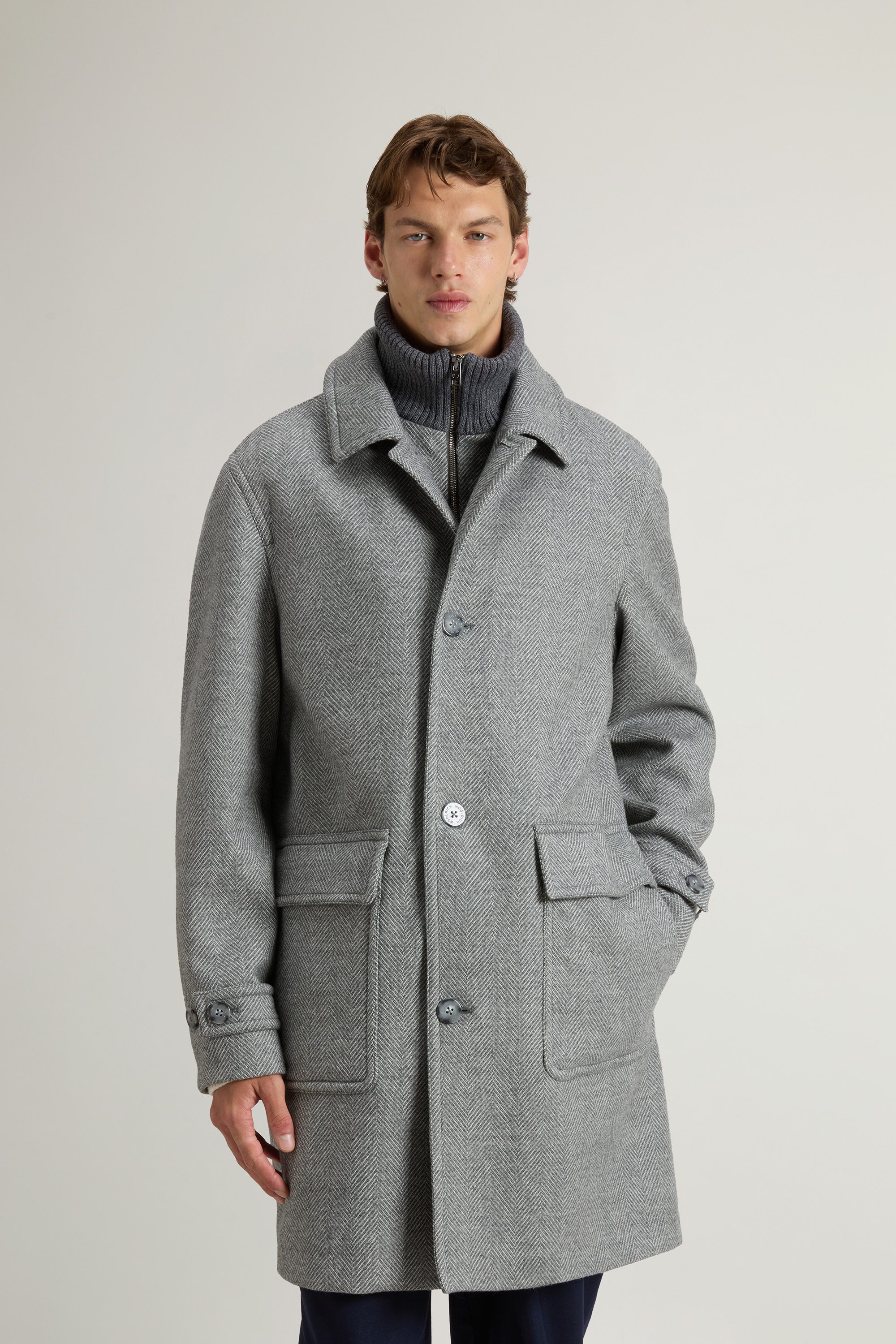 A clean, essential design made to elevate any winter wardrobe. This coat is crafted from 100% virgin wool from Loro Piana, a wind-resistant fabric that offers comfort and protection. The Storm System® treatment creates a protective membrane against rain, dirt, and stains. The shirt collar and removable ribbed knit high-neck insert allow you to adapt the style to changing weather conditions. A two-way zip and button closure, adjustable cuffs, and a back slit with a snap ensure ease of movement. Two flap pockets and an interior zip pocket add functionality, while the logo label on the pocket finishes the look.