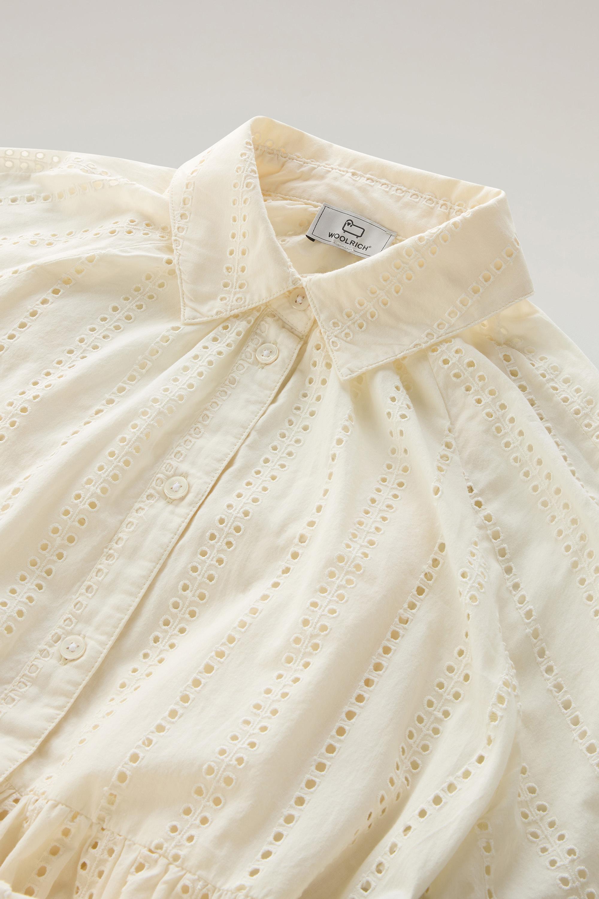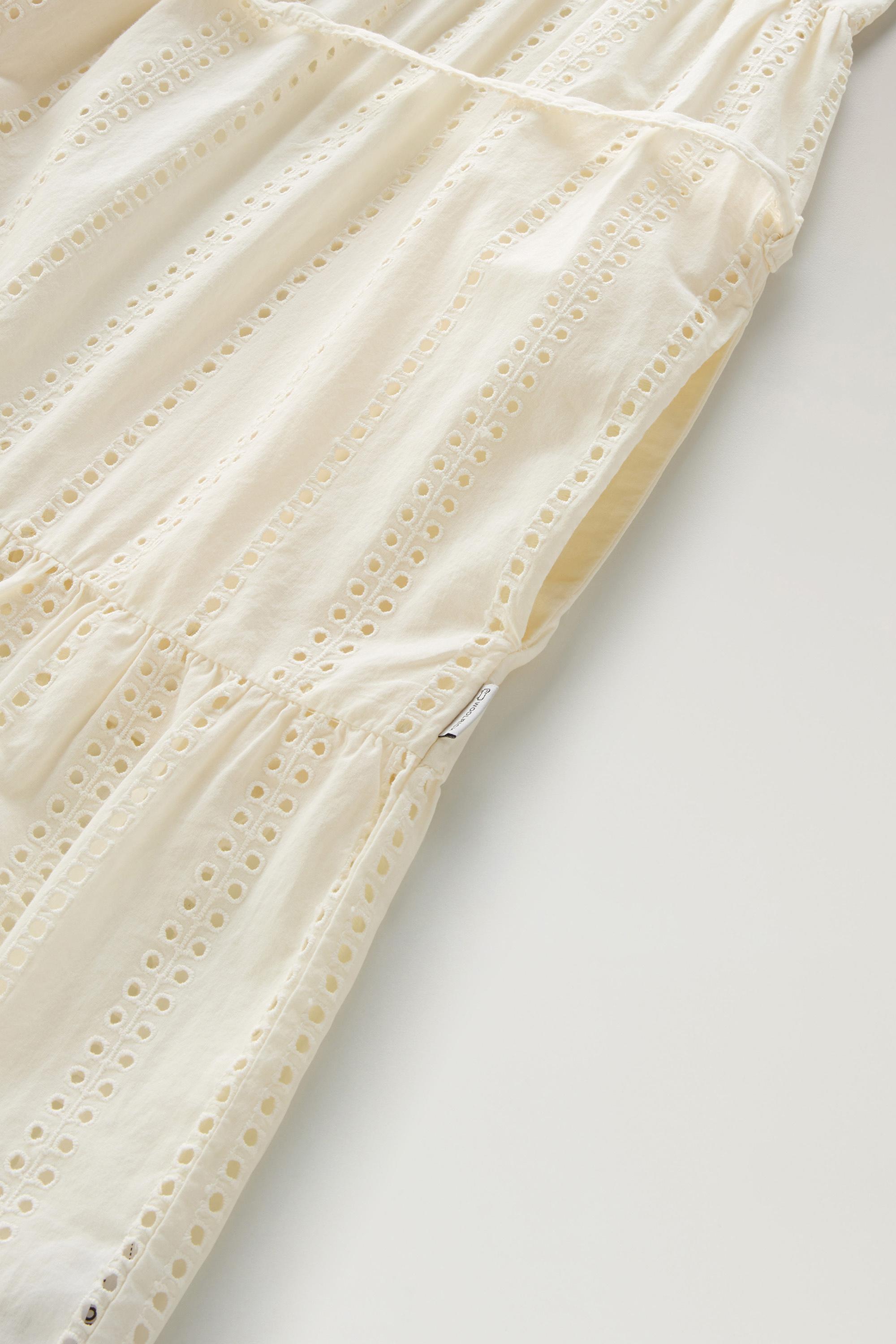 The cotton dress with Sangallo embroidery is a summer classic that Woolrich reinterprets with quality materials and attention to detail. The model has a comfort fit and is easy to customize thanks to the half button closure and the thin belt at the waist. The balloon sleeves and ruffled skirt lend the garment a romantic touch, while the matching undershirt mitigates its transparency.