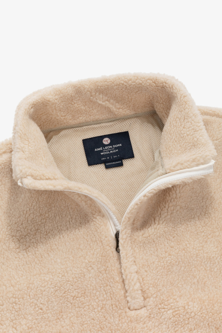 This wool-blend fleece was designed in collaboration with Aimé Leon Dore. It has a high collar, a half zip closure, and elasticated cuffs and hem.