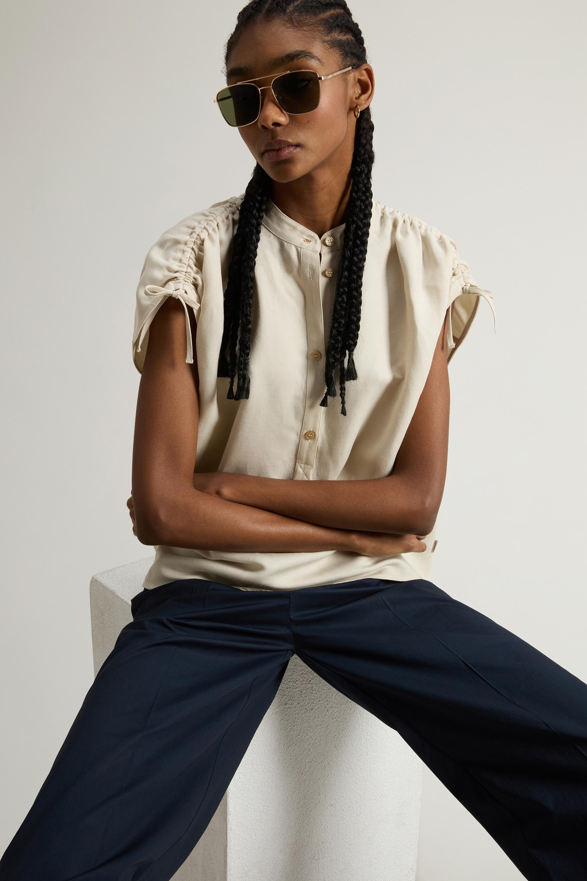 This blouse is ideal to pair with jeans for a casual look or a skirt for a more refined style. Made from a lightweight blend of viscose and linen, it’s fresh and comfortable. The design features short sleeves, half-length button fastening and adjustable gathering on the shoulders.