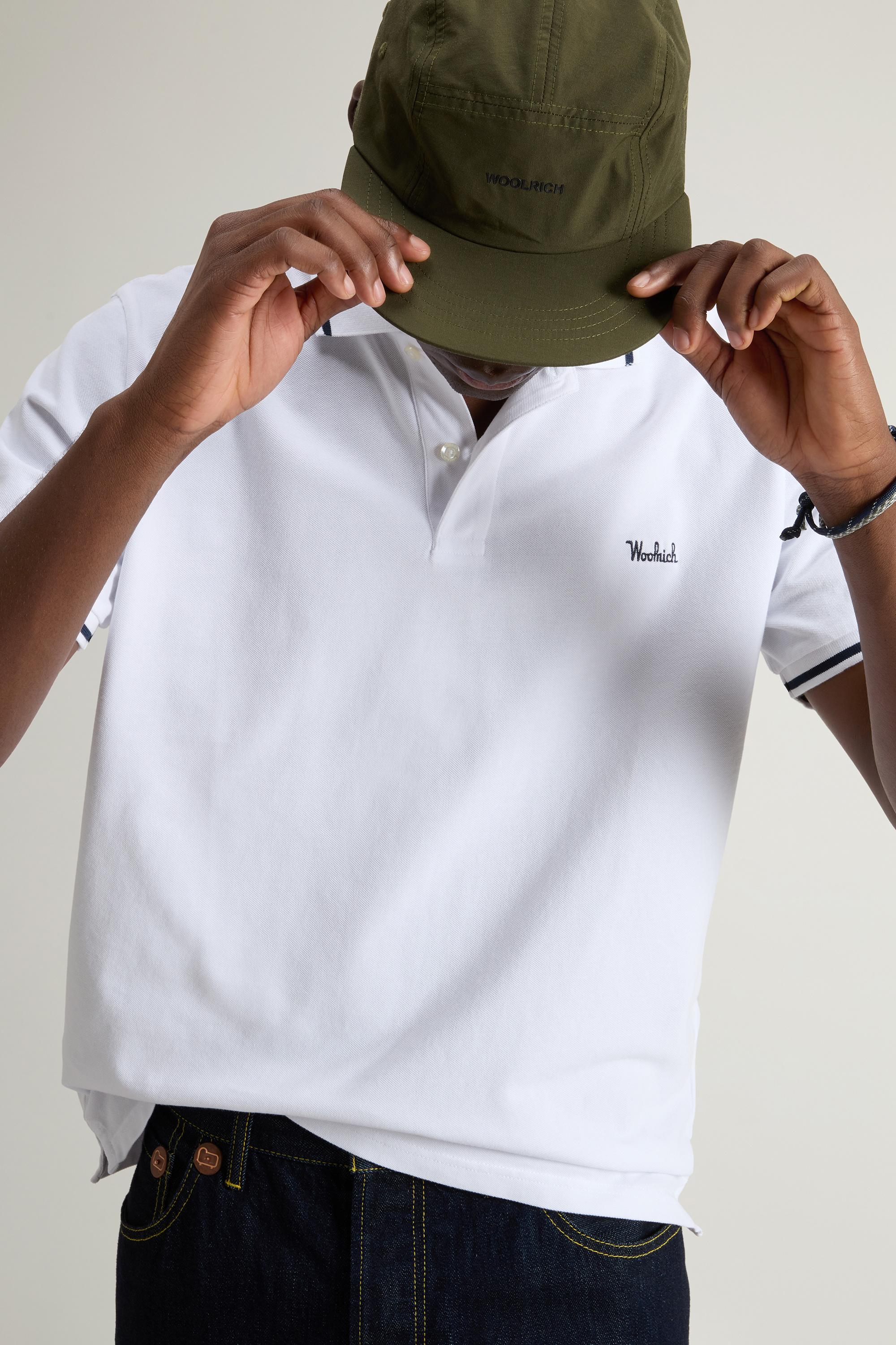 Casual in shape and refined in detail, this polo shirt adds a graphic touch to your look. The model is made from stretch cotton piquet and features a slim fit with vents on the sides for maximum freedom of movement. The collar and sleeves are finished with a striped pattern, while the embroidery on the chest reinterprets the Woolrich lettering in italics.