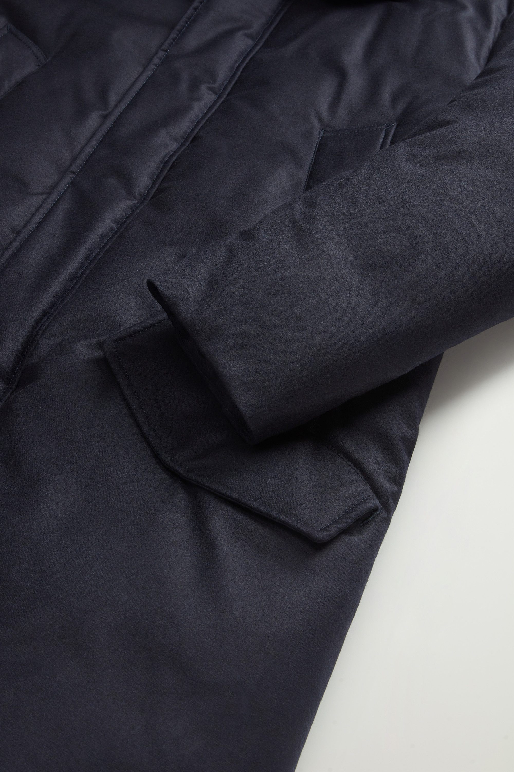 The iconic silhouette of our Polar Parka is dressed in wool and silk for this sophisticated outerwear piece. Made from a Loro Piana fabric with the Storm System® treatment, creating a protective membrane against rain, dirt, and stains, it is water-resistant and wind-resistant. Filled with duck down to provide warmth and softness, it features an adjustable hood with drawstrings. The snap button and hidden zip closure give the design a refined and minimalist look. The coat comes with a range of functional pockets: two handwarmer pockets and two flap pockets on the outside, two snap button pockets, and one zip pocket on the inside. The internal drawstring allows for an adjustable fit.