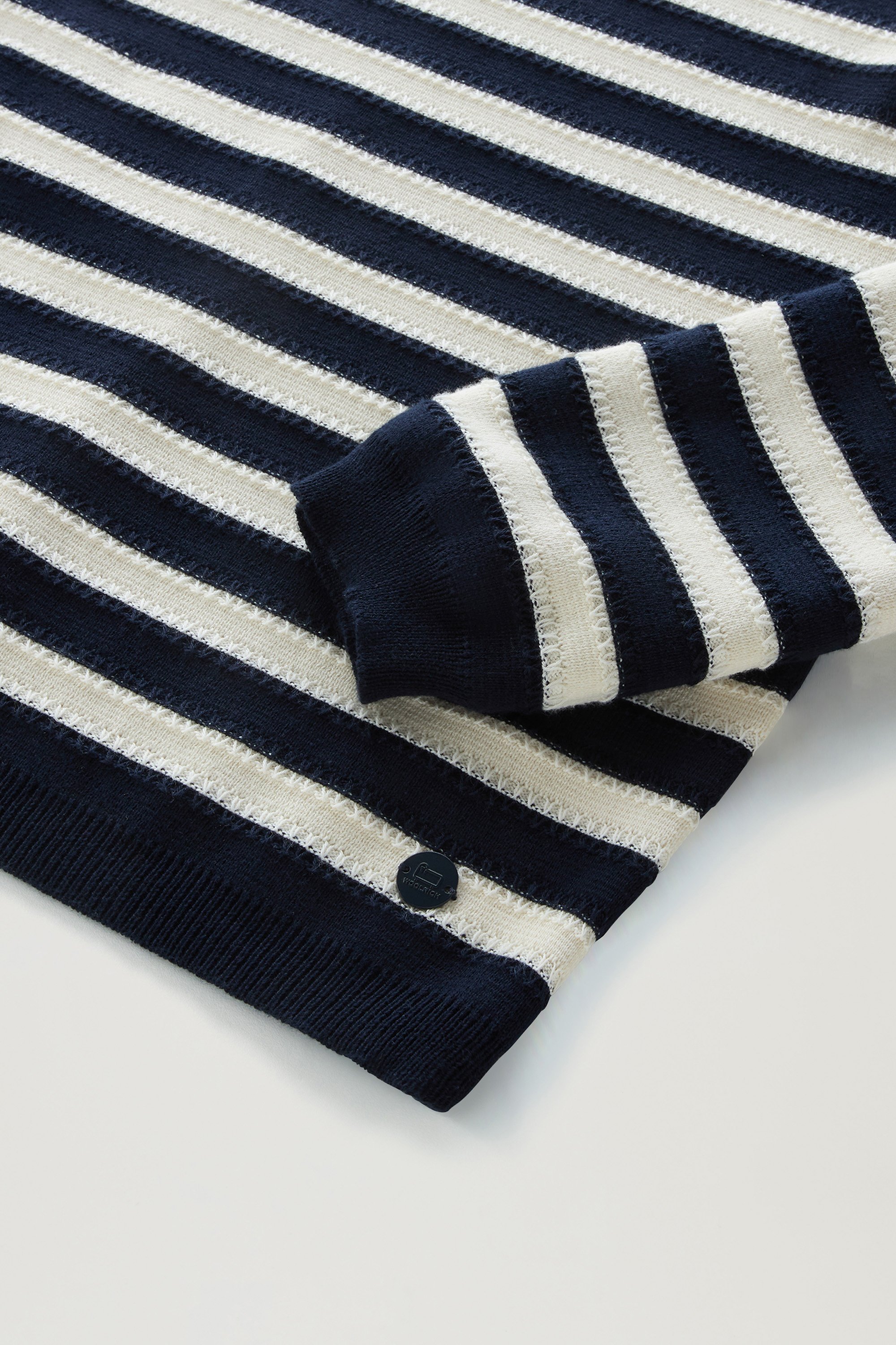 Made from pure cotton that feels soft on the skin, this boat-neck sweater has a slim line that enhances the silhouette and adds a feminine touch to any look. The model is characterized by the tactile texture that creates a refined feature of embossed stripes. Personalized with a removable metal tag with logo.