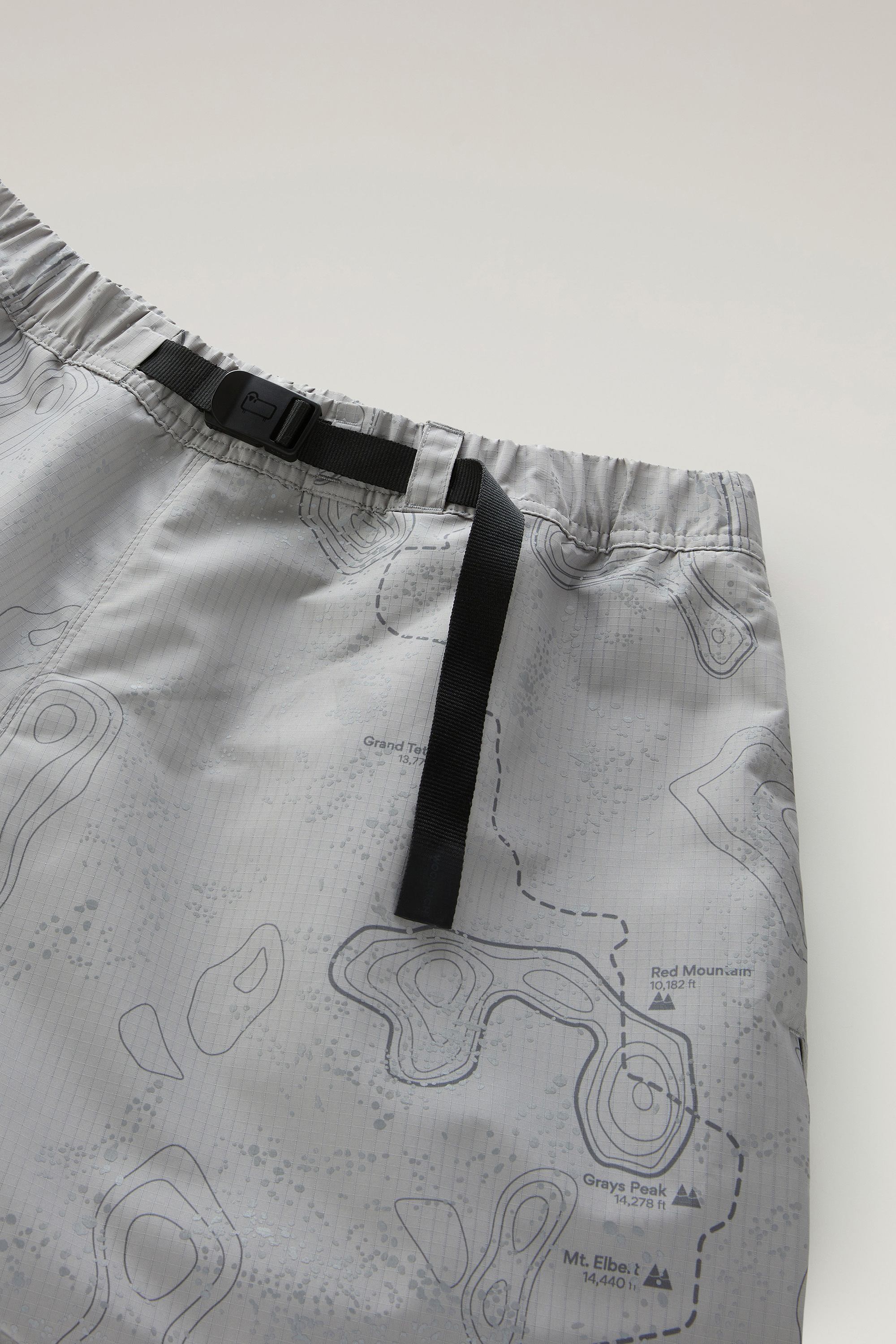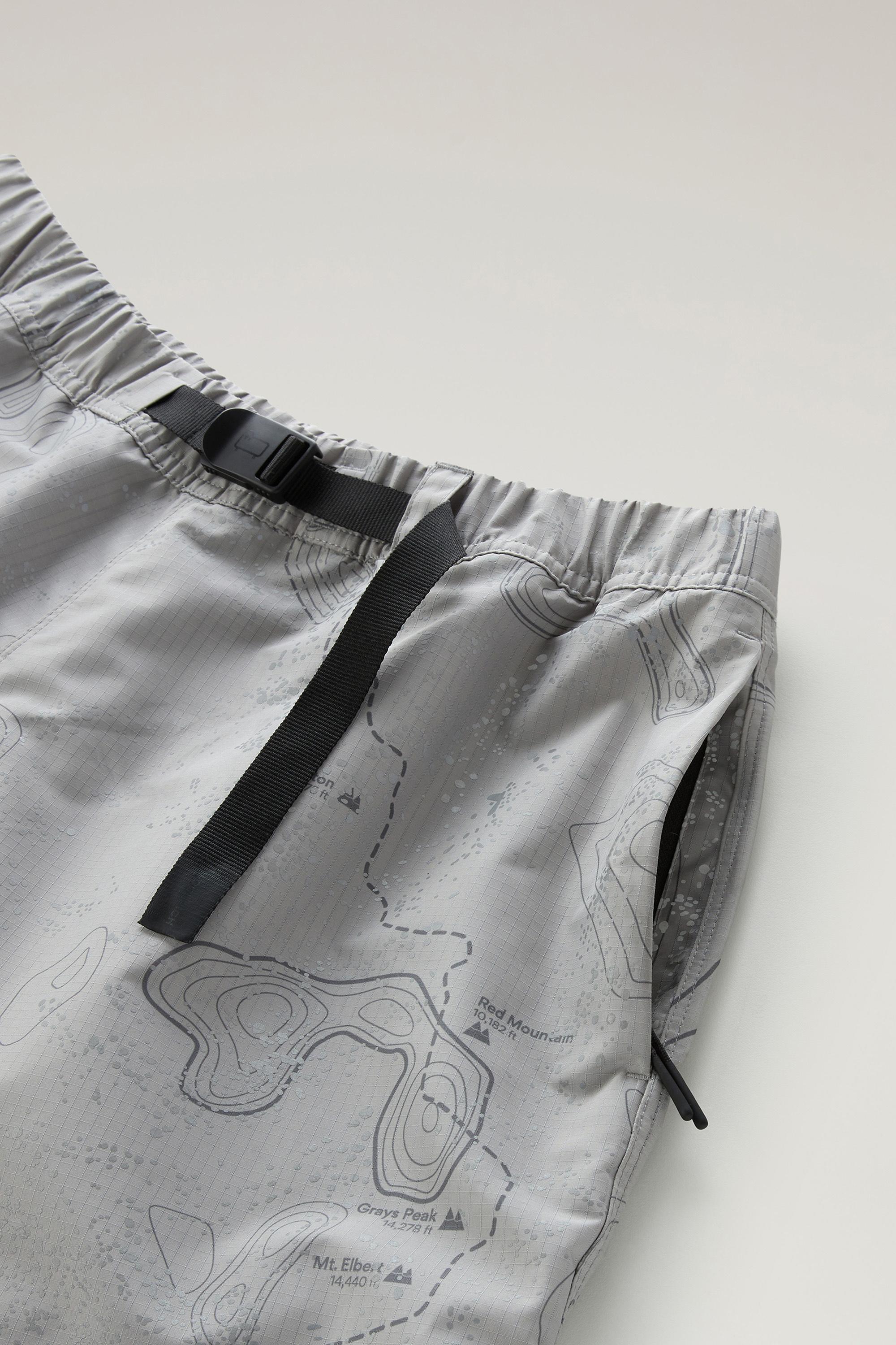 Men's shorts are reinterpreted with modern proportions, quality materials, and details designed for the outdoors. This model, made from waterproof and windproof Ripstop fabric, features a reflective print inspired by the hiking world. The elastic waist with nylon strap allows the wearer to customize the fit, while the multiple zippered pockets are convenient for organizing your essentials.