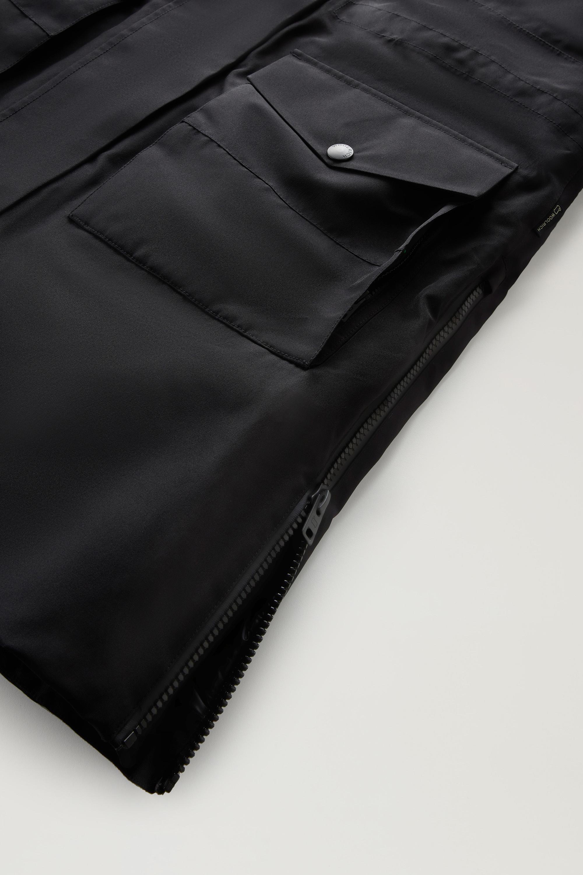 High performance and contemporary style come together in the High Tech jacket. Crafted from recycled GORE-TEX, it's waterproof, windproof, and breathable, fully taped for absolute weather protection. Insulated with duck down, it's horizontally quilted on the inside to better retain warmth. With clean lines and a modern cut, it features a hood with an embossed logo visor. The double-sided zipper closure and hidden snap buttons maintain the sleek appearance. Two external zippered pockets and two internal Velcro pockets offer practical storage. Side slits with rubberized zippers make it perfect for layering.