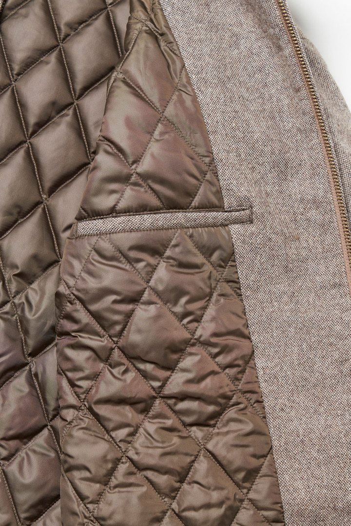 A classic for the season, this vintage-inspired jacket from the Outdoor Label Designed in Japan collection is suitable for both your casual and slightly more formal looks. Inspired by Woolrich archive models from the '80s and '90s, it's made from recycled wool tweed and features the classic pointed collar with a tab to fasten it when pulled up. The lining has a diamond quilt pattern and is insulated with PrimaLoft®. It has a concealed zip closure, two convenient external pockets, and an internal pocket. The cuffs with brass buttons are adjustable.
